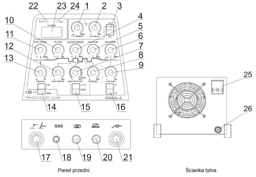 зварювальний апарат TIG 210 AC / DC PULSE - це інверторний пристрій, виготовлений за технологією IGBT . Використовується для ручного зварювання постійним і змінним струмом методом TIG і постійним струмом покритим електродом (метод MMA), а також якісними сталями, міддю і її сплавами, легуючими електрод в оболонці інертного газу (метод TIG), а також алюмінієм і його сплавами зі змінним струмом. Це інверторні пристрої, виготовлені з найбільш високотехнологічних компонентів ,виготовлених за технологією IGBT. Він широко застосовується як у виробничих, так і в сервісних роботах. Призначений для роботи в закритих і критих приміщеннях. Зварювальний апарат дозволяє повністю регулювати і контролювати всі зварювальні параметри характеристик дуги і імпульсу. Він має запалювання HF , функцію 2t/4T і дисплей для індикації зварювального струму. Пристрій характеризується відмінними зварювальними властивостями, особливо рекомендується для професіоналів. У комплект входить тримач для зварювання TIG з газовим охолодженням і масовий провід з кліщовим затискачем. Обладнання TIG 210 AC/DC PULSE використовується для ручного зварювання струмом конструкційних сталей покритими електродами (метод MMA)